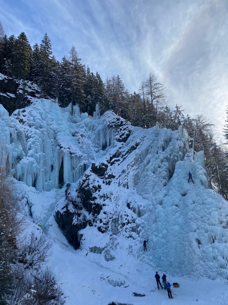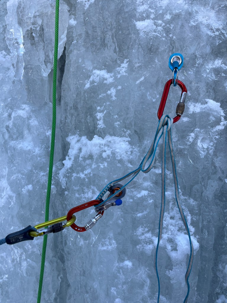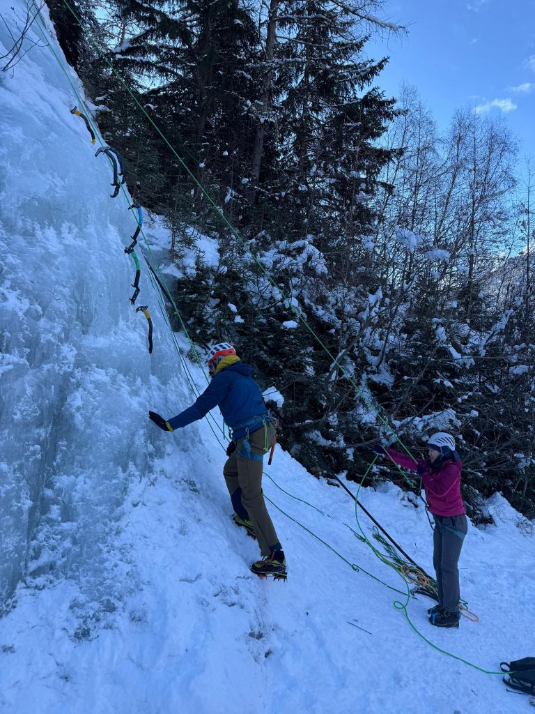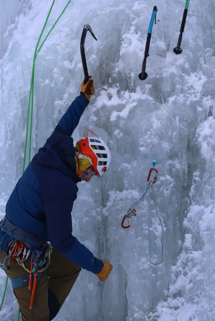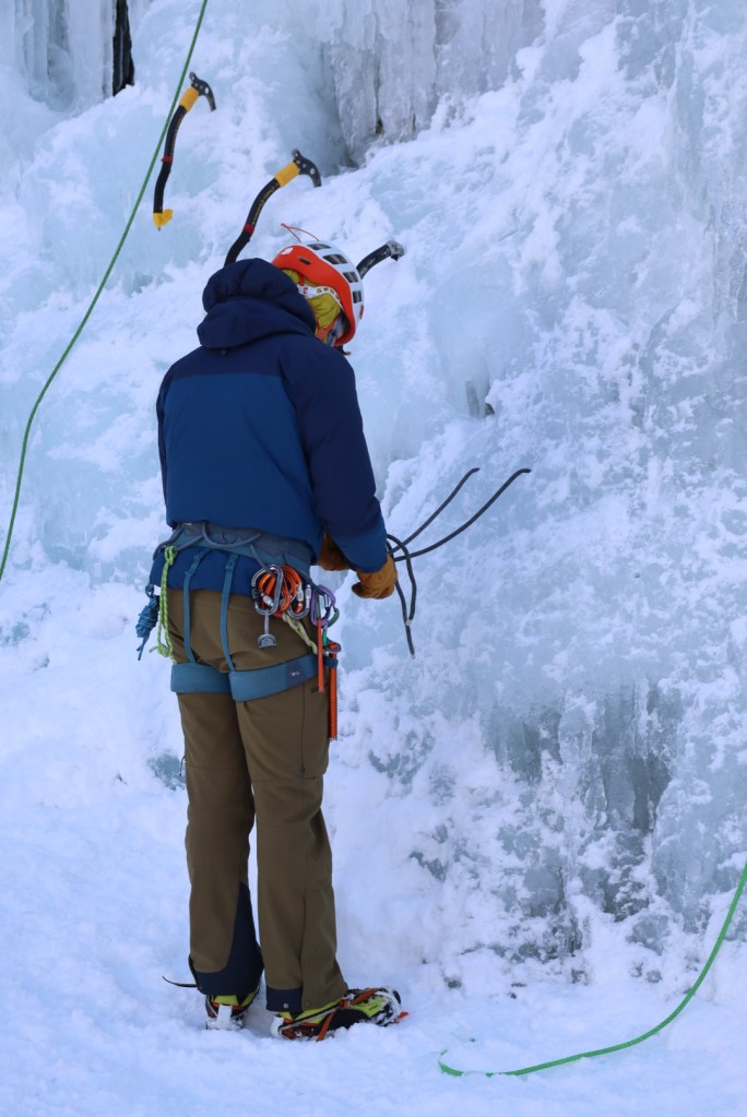 Small steps: The guide kept emphasizing this. Small, deliberate steps instead of big reaches. I struggle with this in sport climbing (always making huge reaches because I’m short) so practicing it on ice felt like good cross-training.